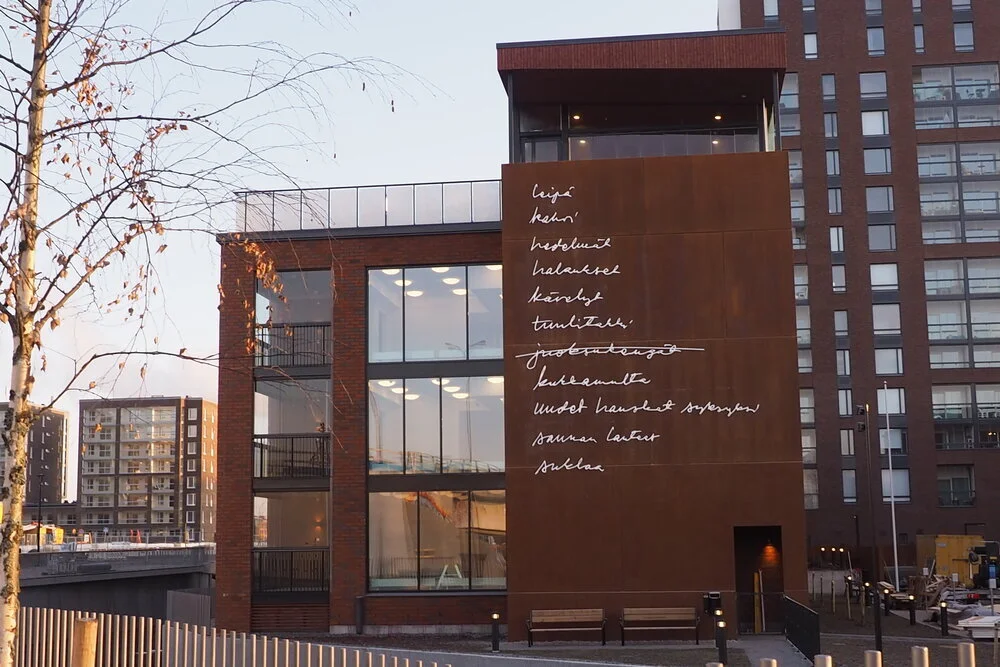 Both facades have their own lists, in which the viewer can perhaps recognise two people, of the same person in different times. The words might have particular connotations to Finnish people, guiding the imagination to relatable everyday themes, concepts and values.