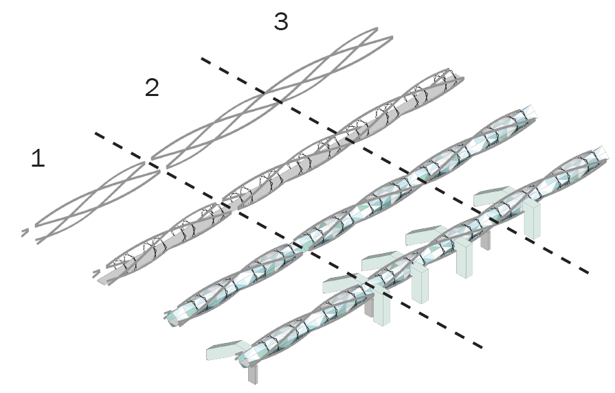 Following the brief, the bridge was designed as a closed space in order to protect the users from rain and other undesirable weather conditions. Glass soon became the natural choice for material for the panels covering the form, to make the space feel less closed in.